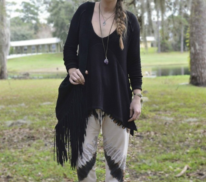Get My Look: 1. Tie-dye harem pants. 2. Black sweater. 3. Fringe tote.