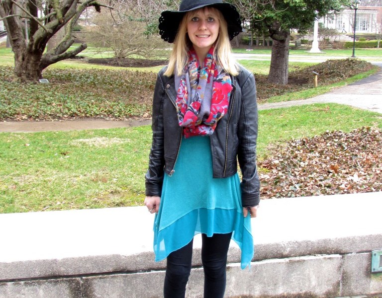Last week, I wore a flowy aqua tunic that was appropriate for springtime, but styled it with different layers to combat the chilly winds.