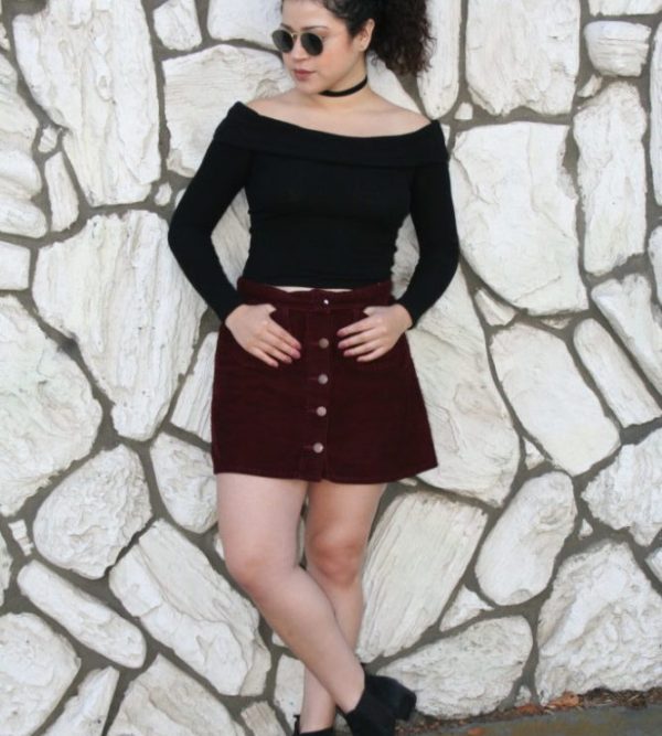 In the spirit of fall, I opted to stay on the darker side and choose two colors that go hand in hand. Working from head to toe, I’ll begin with my hair and sunglasses. As some of you may have noticed, I have been given a generous amount of hair on my head. So for this look, I decided to tame my curls in a classic ponytail to emphasize the black velvet choker I was wearing. Â Although the days are getting shorter and the sun is not out as long, sunglasses were a must to add an extra style factor to this look. Moving back to the choker, I chose it to elongate my neck and make my off the shoulder top stand out even more. I paired the top with my favorite burgundy corduroy skirt along with some signature black booties.