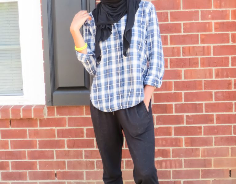 Get My Look:Â 1. A plaid boyfriend button-down. 2. A pair of light joggers. 3. Sunglasses. 4. A pair of Vans tennis shoes. 5. A neon bracelet.