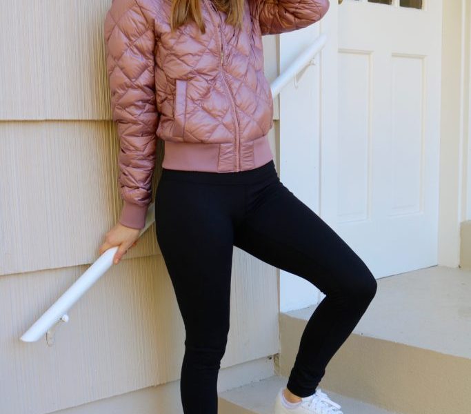 In this look, I started with a basic pair of black leggings. They are easy and can be found in everyone’s closet. Then, for the wow factor of the outfit, I chose a soft purple, quilted bomber jacket that is too gorgeous for words! A bomber jacket is a perfect piece to add to your wardrobe because with all the different styles, colors, and embellishments available, it’s easy to find one that perfectly describes you. I’m a girly-girl at heart, so light purple was an easy choice. In addition, bomber jackets are fitted, warm, and best of all, comfortable. So you can walk into class after throwing on this jacket over a tank top and you’ll still look chic and put-together.