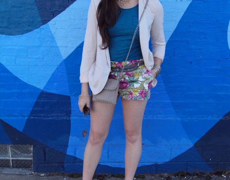 As for my look, I translated Hoffman’s collection through a teal basic pocket T-shirt tucked into a pair of tropical print shorts—again, I’m obsessed with this print! I went with platform sandals, a cross-body bag and gold accessories to dress up the look and topped it all off with a beige boyfriend blazer because I love how sleek, yet effortless blazers can be. Boyfriend blazers are the real MVP here.