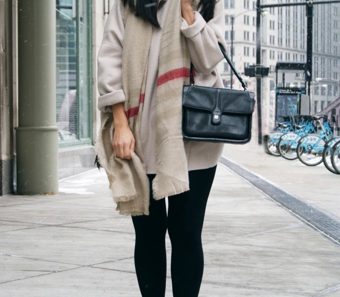 Get My Look: 1. A warm boxy beige coat. 2. A thick blanket scarf. 3. A timeless, black mini bag.