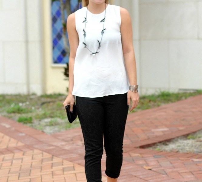 Texture is very prominent in the collection and is shown in pieces that appear as though they were purposely scrunched and never ironed. In other looks, a leafy print prevails as the main focus. With this in mind, I decided to put my own spin on this use of texture and design. My black felt pants detail a subtle black print while a lacey cutout covers the entire back of my white top. One accessory seemed to be prevalent in almost every look in the collection—a killer pair of black boots. The repeated use of thigh-high boots is a very cohesive way to tie in the entire collection. My most recent steal is a pair of Restricted black cutout booties from T.J.Maxx. They’re great for both day and night and add to the overall edginess I was hoping for. I am also a huge fan of the way this collection used straps in different looks. I used this as inspiration for my necklace and bracelet, which add dimension and a little sparkle.