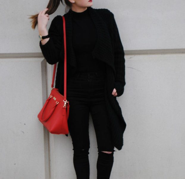 This outfit has different pieces that come together to form a finished piece. I paired a long-sleeved turtleneck sweater with a comfy black cardigan. Depending on how cold it is, a thicker coat can be added to the top of this outfit. As you can see, these layers provide warmth without creating the unwanted bulkiness. I also wore black jeans with holes in the knees to give the outfit a grungy feel. I added a few accessories like my black watch with a gold rim and my red shoulder bag (similar bag here). Finally, to complete the outfit I wore faux suede booties in black.