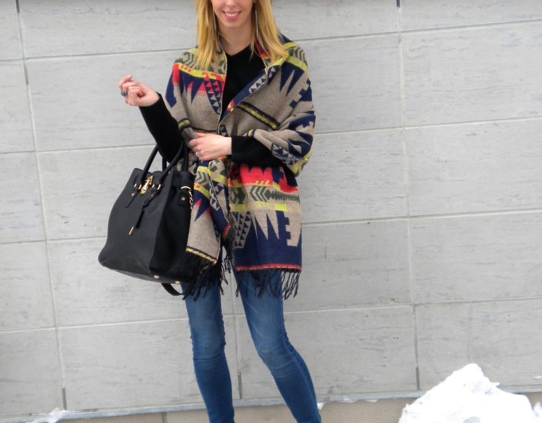 Get My Look: 1. Blanket scarf. 2. Cashmere sweater. 3. Skinny jeans. 4. Black heels.