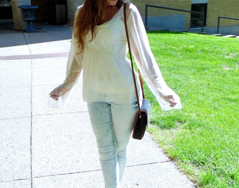 Inspired by Keller’s wispy fabrics and intricate detailing, I scavenged for a piece that would showcase my own inner bohemian goddess. Believe it or not this shirt was my mother’s from high school! I was drawn to the loose and drapey fit of the sleeves as well as the lace detailing. As seen in many of the pieces in the Chloé collection, the loose fit style of the shirt caused the material to flow in the wind as I walked, creating a very natural and bohemian vibe. To give my outfit an extra pop against the off-white shirt, I opted for some eye-catching jewelry. For rings I chose a rose-gold piece in the shape of an arrow purchased from Juicy Couture. On my middle finger rests a ring with a pop of turquoise.