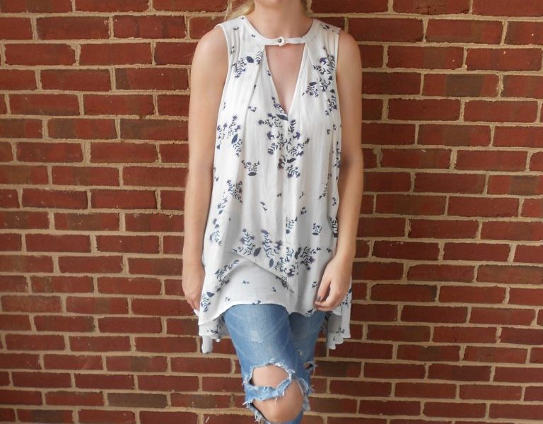 For this outfit I chose a long crisp white and floral tunic with a deep V-neck and choker detailing. I paired it with my distressed boyfriend jeans to make the outfit a little more casual. To keep with the bohemian vibe, I cuffed the jeans and added a pair of lace-up gladiator sandals, which I have been wearing almost every day since I got them a month ago.