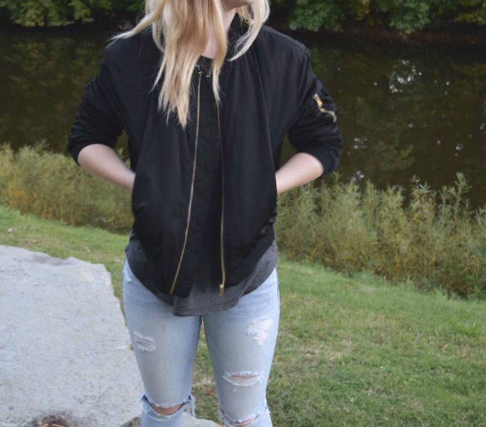 For me, this outfit was lackluster, but the addition of my favorite bomber jacket made it look put together. The gold accents of the jacket added room for accessories that were gold.