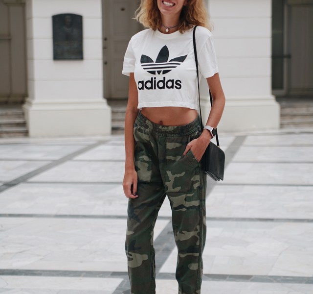 Drawing inspiration from this collection, I have styled a pair of camo joggers, which are always in style, with a white T-shirt and sneakers—I am more of an everyday cool girl than a runway lady. My simple outfit that can be worn on a daily basis is my personal transformation of Versace’s urban energy.