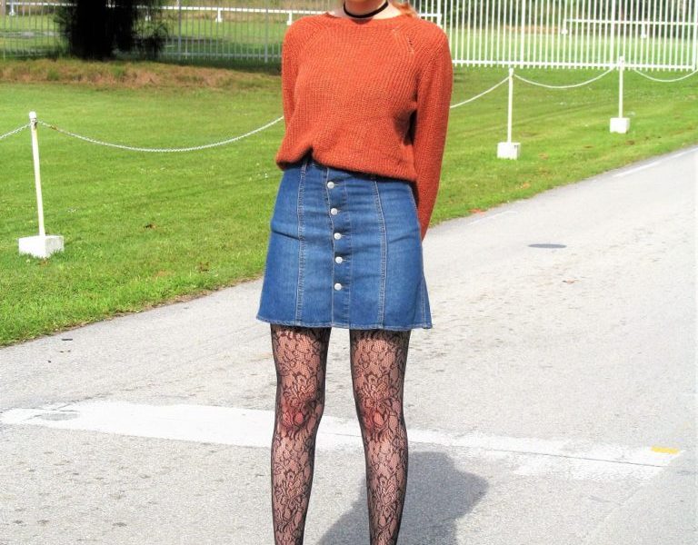 This outfit is a typical outfit I would wear when the temperature drops. Perfect for those whose cities are living comfortably in fall like weather! (Sadly mine isn’t.) The sweater I am wearing is a light caramel sweater. It’s actually a really big sweater that reaches close to my knees. I decided to tuck it into my denim skirt to show my shape. I really love mixing lengths. A baggy sweater with a skirt is one of my favorite looks to wear. To keep a bit of warmth, I added black paisley tights to give my look a bit of contrast and a bit of edge.