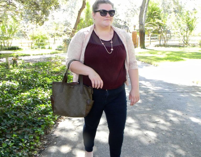 For a more causal look, I wore simple jeans, a T-shirt and threw on a pair of scalloped flats. I love the burgundy color of these, especially with the pink. It gives a pop of fall color on this girly outfit. Not only that, it compliments my matching shirt, bringing the whole outfit together. Keeping a color theme in an outfit is very imperative.