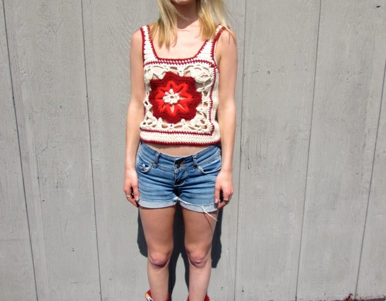 My top, purchased at a thrift store, was an authentically vintage find with a label that reads “hand made by Grandma.” It definitely has a one-of-a-kind feel, not to mention it is one of my favorite color palettes: red, pink and white.