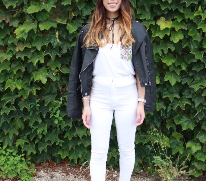 Get My Look: 1. Serengetee white T-Shirt 2. White high waisted jeans 3. Leather jacket 4. Ankle strap heel