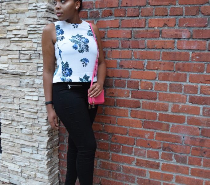 For an interest meeting for one of the many organizations I’m involved in, we were told to wear a business casual ensemble. After shuffling through several blazers, slacks and heels, I decided on an outfit that was appropriate for the event, while still showcasing my inner Fashionista. My floral top was a perfect fit in showcasing my fun girly style. Because the event was later at night, we had a break from the excruciatingly warm weather we’ve been experiencing here in Richmond. For that reason, I decided on a pair of black pants that wouldn’t overpower the top. The zippered pockets in the front gives the pants an edgier feel, ensuring that I’m not overdoing it with my overall girly persona. For a pop of color, I opted for a hot pink cross-body purse from Juicy Couture. To top it all off, the ankle strap heels I paired the look with allowed me to pull together the business casual, yet very feminine look.