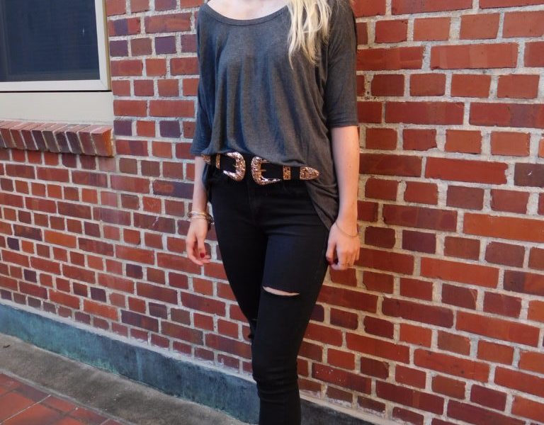 With this double buckle belt, I decided to wear black jeans that I ripped myself (thanks, YouTube tutorials), a gray quarter-sleeve blouse and black booties. The color scheme of gray and black makes this outfit perfect for the upcoming fall season. The double buckle belt is an attention-grabbing gold, so accessories had to be minimal. This is why I only wore my black beaded choker and stacked a few Alex and Ani bracelets.