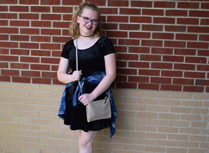 A personal fall and winter staple of mine is velvet. A large portion of my fall and winter wardrobe consist of velvet items. This is why the fabric had to be featured in this post. The look consists of a classic black velvet skater dress, with a black velvet chocker, a blue and white flannel wrapped around my hips and black sneakers. This is a fun, confident outfit to wear with the resurgence of the ’90s grunge trend.