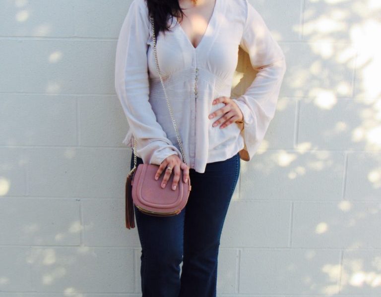 I am pairing my favorite dark denim wide-leg pants with a neutral bell-sleeve top. I like the banded bodice with channel seaming near the waist area, which gives a great shape to my body. This top was originally open from buttons to hemline, but I stitched the neck area a little bit so I can wear it without having to wear a camisole every time. I paired it with brown booties, huge earrings and a blush colored cross-body bag. This top looks amazing with skinny or flare jeans and boots or booties. You could also wear this look now with distressed denim shorts with over-the-knee boots.