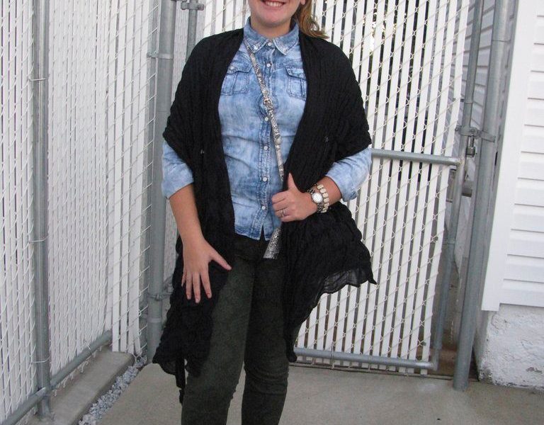 Within Tod’s S/S 17 collection, I noticed python materials mixed with neutral tones. To resonate this feature, I added my favorite python cross-body, and paired it with damask green, printed bottoms and a jeweled denim shirt. These key items keep a neutral color palette, but mix the fashionable prints and fabrics as shown in Tod’s runway show. To further accessorize and match to the grey palette in my cross-body bag, I added pops of black with a feminine ruffle shrug, trendy lace-up flats, and simple, silver jewelry.