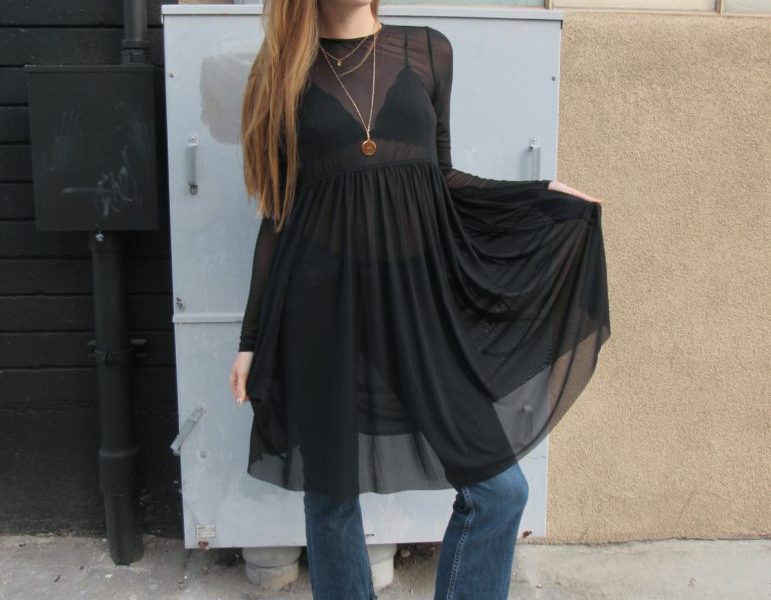 Have you ever had those mornings where you wake up and cannot seem to make a decision between two favorite items of clothing? I often feel obligated to arrange the elements of my look into a particular category: edgy or feminine, classic or trendy. This school of thought can be extremely limiting when it comes to making a fashion statement, and so last week, while feeling quite indecisive, I resolved to piece together cut-offs and a sheer dress. Maybe I’m just extremely boring, but wearing a completely sheer outfit over cropped blue jeans is potentially one of the riskiest moves I’ve ever made, fashionably speaking. I snagged this piece ($29) during an Urban Outfitters sale hoping it would function as a fun addition to my limited “going out” wardrobe, which currently consists of a backless bodysuit my sister grew tired of and an old black skirt from Zara that has become “mini” since I’ve grown taller over the years.