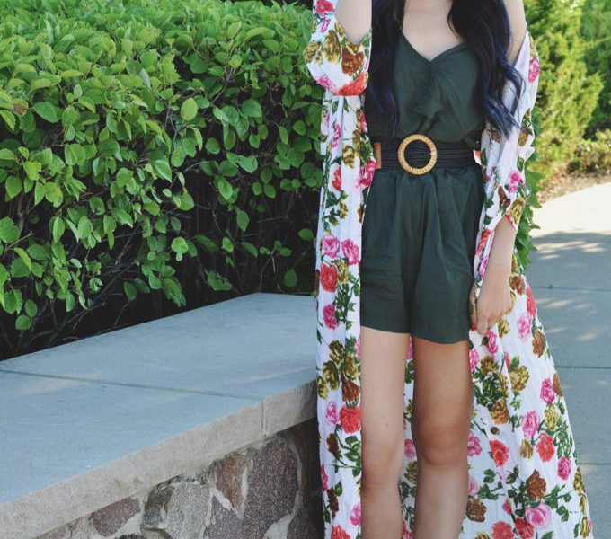 The brand image that Gucci has shifted to under Michele’s creative direction has been repeatedly catching my eye for the past few seasons. Drawing inspiration from this collection’s use of muted, yet bold florals, I chose to highlight an item that I thrifted from a vintage store last summer. Though I believe this was originally used as a light robe, I am wearing it here as a long cardigan, which is a perfect cover up for those cooler summer nights or a great layering piece during the winter months as well. To keep the color scheme and overall feel of the outfit consistent, I matched it with a muted green romper, wicker-embellished belt and my all-time favorite wooden heels.