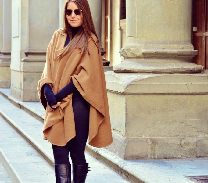 Get My Look: 1. A tan shawl 2. Basic black leggings 3. Classic leather boots 4. Sunglasses
