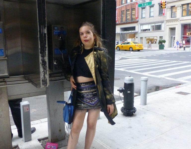 My main statement was all about the skirt. It’s a Parker skirt I got while thrift shopping, and I’m obsessed with all its glam. It’s one of those absolutely unique pieces I’m always desperate to add to my closet, and works for any Fashionista who is looking to stand out. I wanted to match the gold tones with my own gold trench: it might be hot outside, but it has been rainy, and I couldn’t resist adding my favorite touch—a coat—to the outfit.