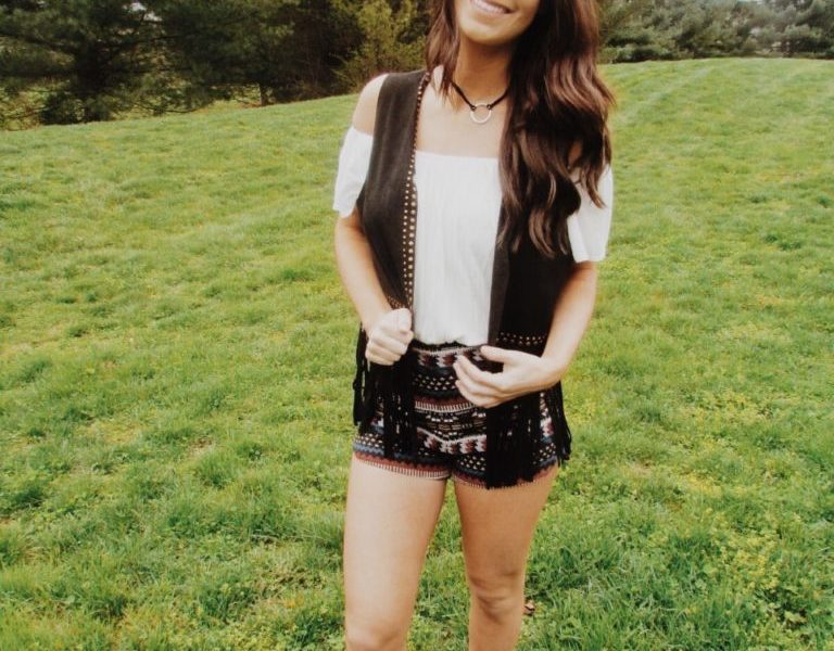 For this fest look I am wearing a white off-the-shoulder blouse with a studded black fringe vest on top. The plain shirt really makes the studded vest pop and draws the focus onto the main part of the outfit: the shorts. These aztec high-waisted shorts are my favorite gem in my spring closet. They can bring any simple look to life, and they’re also very comfortable. The shorts make a statement and the other components of the outfit are a bonus. The outfit requires little or simple accessories because so much is happening with the shorts. I chose to pair the outfit with a silver circle choker tied with black strings. This necklace sets the flow of the black theme in the outfit from the shorts, to the vest, to the choker. All great outfits should have a good flow.