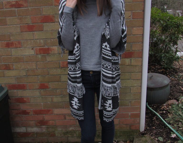 For my, look I paired dark washed skinny jeans with a gray turtleneck. To layer over the turtleneck, I added this tribal printed cardigan with a hood. I find this to be so comfortable throw on over a long sleeve top like this to give it a nice touch and add an element to the look. I like that it is short sleeve too, so if it’s a cooler summer day like we have in Pittsburgh you don’t feel like you’re going to overheat. To finish the look I added a pair of brown chelsea boots.