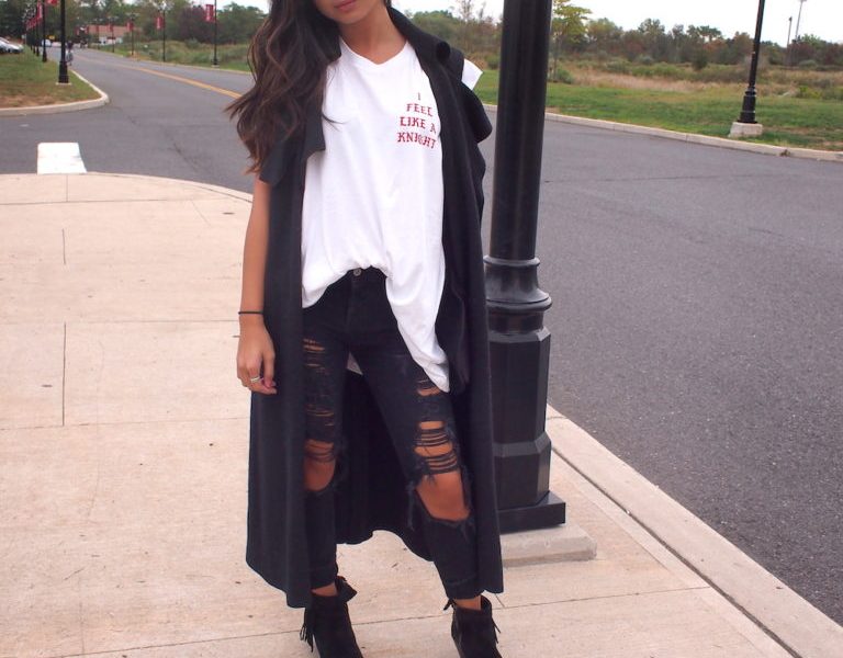 Despite popular belief, it is indeed very possible to mix comfort with edginess. Jeans don’t always have to be a nuisance. This pair of Carmar jeans are perfect for the fall season featuring a boyfriend style fit and some intense distressing, making it much easier to move around in while also adding an edgy aspect to the outfit. The star of the show may just be my Life of Pablo inspired tee featuring Rutgers University’s mascot–the scarlet knight. An otherwise basic tee, I took off the sleeves and opted for an extra-large to add a baggier feel to the look. The “I Feel Like a Knight” graphic and the incorporation of Rutgers’ chant on the back puts an interesting spin on average college merchandise. To put it all together, I topped the outfit off with my infamous sleeveless duster coat from Zara and suede booties from Sam Edelman, both perfect for adding an extra layer, some texture and a unique touch to the otherwise basic outfit.