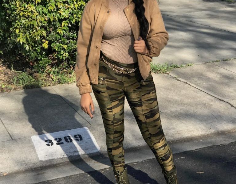 In this outfit I have some military pants paired with a turtleneck shirt. Since it is still winter, I added a suede bomber jacket for warmth. I accessorized this outfit with some round sunglasses that had a gradient affect and reflected the same color scheme as my outfit in the lenses. I tied the look together with some suede green military boots that I am absolutely addicted to! You can find these boots at an affordable price in many outlets in the Los Angeles garment district.