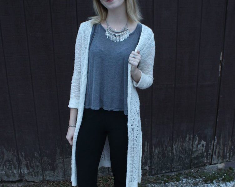 I try to keep my aesthetic simple with a few key details to tie my outfit together. In this case, my base is classic black leggings. These are an obvious staple in any Fashionista’s wardrobe. (You can never go wrong!) I have about a million long cardigans in my closet, but I selected my crème one because it has a subtle stitched pattern. This adds amazing texture and detail to my outfit. I threw on a simple, old gray T-shirt I bought from a little boutique in Rome, Italy, this past summer. The cotton fabric is perfect for a warmer autumn day! I matched my socks with the color of my T-shirt, which is a small detail that makes for a big impact. I added a big statement necklace from Forever 21 to tie it altogether!