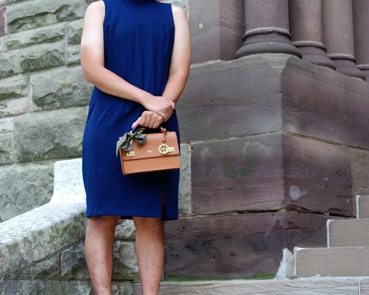 My outfit consists of a mock-neck sheath dress from New York & Company and a brown purse and nude wedges to dress this look up. They really make the blue stand out.