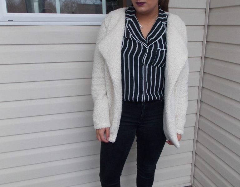My go-to lazy/trying-to-look-nice outfit generally consist off all black. There’s no fuss, it looks effortless because it is. The top is a loose pajama-style button-down from Primark. It is super comfy but it looks put together. My ankle boots may look like a danger to wear with icy sidewalks; however, they are the most comfortable heeled shoe I have ever worn. Find a pair of shoes that look nice but don’t kill your feet. You will become a pro in handling any sort of weather in them. To dress the look down for class, I added this fuzzy coat from Target—do not overlook that store. It adds texture to the outfit. By doing so, you go from throwing clothes on to having a look—something that people will take notice to.