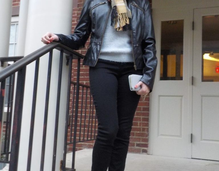 I’ve paired the sweater with plain black high-rise American Eagle Outfitters jeggings and black ankle boots. Jeggings are a perfect option for a school day because they are comfortable, but still look put together. The high-rise also works well with this particular sweater because it is fitted and stops pretty high on the torso. The faux leather jacket and scarf add warmth for walking to and from classes and meetings. I personally love the classic pattern of the scarf and the fact that it isn’t super bulky. The leather and zipper details on the jacket contrast with the overall soft feel of the rest of the outfit and helps to vary the texture.