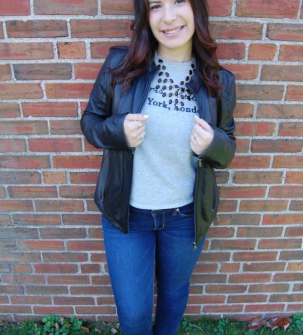 Paired with the leather jacket, I have on a graphic T-shirt that says “Paris, Milan, New York, London” and it is one of the best pieces in my wardrobe—it goes with everything and it is a nice material so it can be dressed up easily. With the T-shirt, I have a black statement necklace that pops with the black lettering on my gray shirt. I have on dark wash jeans that easily translate into a nighttime vibe and my black Rubin Steve Madden booties. This is my second pair of Rubin booties because I wear them so much that I wore out the first pair—I was so glad to see them still available.