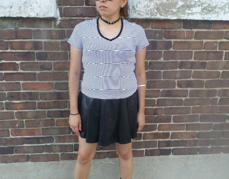 Here’s a little secret: instead of wearing a faux leather skirt, I wore a faux leather dress! I simply slipped a striped T-shirt—a must-have of mine–over my black faux leather dress. Not owning a skirt like the one in the collection and using the bottom of my dress to copy the look instead allowed me to make this runway look my own.