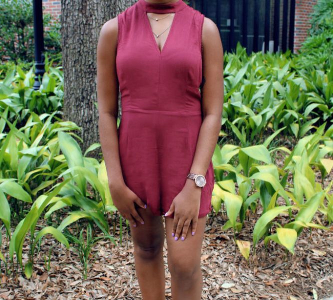 In the pictures above I am wearing a short and sleeveless garnet romper. It is simple but I loved the design on it when I picked it out in the store. I knew it would be easy to dress up or down and it would definitely be comfortable to wear to class. I paired with my white low top Converse. Also, being that I am a Florida State Seminole, I find that garnet and gold complement each other so I chose gold jewelry. I layered my gold pendant necklaces and wore some gold stud earrings. I also wore my watch that I love wearing as an accessory because it seems to go with everything.