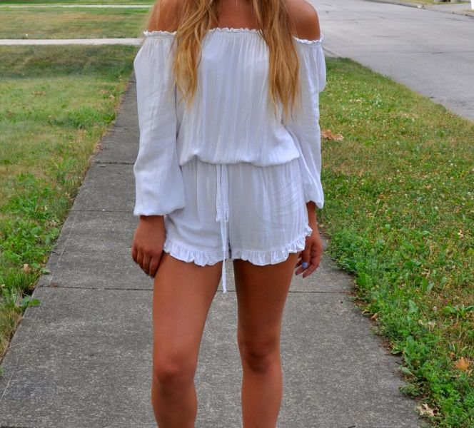 Get My Look: 1. White romper. 2. Strappy sandals. 3. Windswept hair.