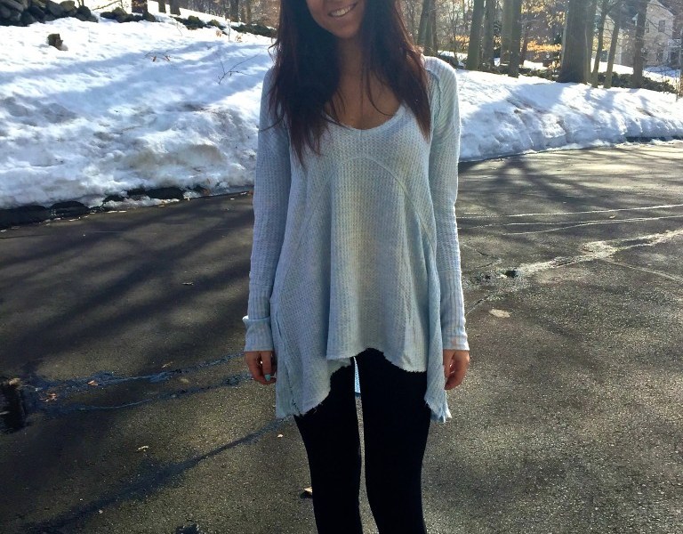 I decided to put together an everyday look of my own after falling in love with this look. I tried to follow a similar color scheme to the model shown. I pulled out a pastel blue Free People thermal and paired it with shiny black leggings. I threw on my favorite pair of platform Converse decked out in gold zippers and studs. Without even planning it out, I realized my nails were painted pastel blue, which matched perfectly with my top.