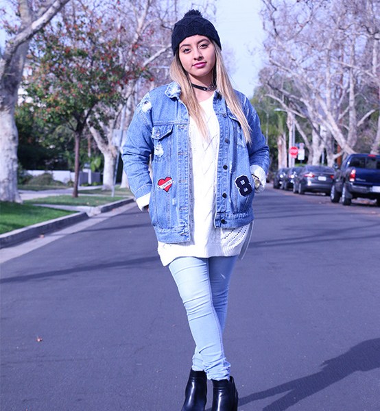 To rock this denim look it is also a great idea to go for a longer shirt or sweater underneath a denim jacket because it creates contrast with the slim fitting lower half. For this particular look I am wearing a long, oversize knit sweater from Express and light-wash denim jeans. As for my oversize jean jacket from Forever 21, it is a slightly darker shade of denim and has fun graphic patches all over it. To top it all off, I put on these super chic and utmost comfortable black booties. There is the infamous double denim look that everybody secretly loves!