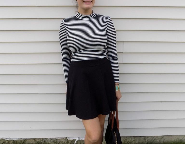 While a topknot is versatile, I chose to go with a preppier look with my sleek hairdo. I wore my high-waisted circle skirt and paired it with a striped crop top so the outfit was classroom appropriate. As soon as the weather hits about 60 degrees, you can expect to find me in long sleeves all the time. I am obsessed with the high-collared trend, so this outfit will definitely be a staple item in my wardrobe this season.