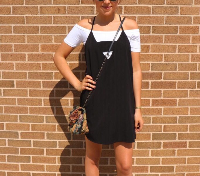 The main focus of my look is a black slip-on dress with a triangle cutout in the bust area, revealing an off-the-shoulder white top. To add more texture, the choice of bag is a floral studded cross-body bag. Gold jewelry accents the black dress and a pair of suede platform booties complete the look in an edgy manner. A pair of brow-line sunglasses can add focus to one’s face and neckline.