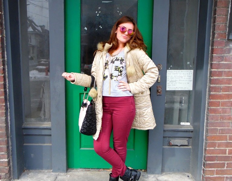 Throughout the collection you see various pairings of boyish jerseys with pleated skirts, meshed tights and heels. Though it is unfortunately still too cold for skirts and tights here in the chilly city of Louisville, KY, I still wanted to incorporate Hilfiger’s look into my daily wardrobe. Instead of freezing in a pair of tights and a skirt, I opted for maroon skinny jeans and a jersey inspired sweatshirt stitched with a floral print number. I put a girly spin on my sporty look with a pair of pink Steve Madden shades and my Betsey Johnson tote. For accessories, I chose a chunky tapestry necklace and a simple gold ring. Completing my look, I bundled up in a hooded puffer coat, as seen in a few looks from Hilfiger’s collection. Though my look isn’t exactly as intimidating as the brawny uniforms you would typically see on the football field, I still think I could kick some butt in my floral print!