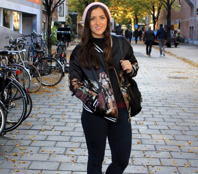 While in Amsterdam, I went to the Anne Frank House, Van Gogh museum and of course, did some shopping. The Puma creepers I am wearing I purchased while in Amsterdam! They were definitely a daring purchase, but the gold surprisingly matches everything. Metallics are a fun way to dress up your neutrals. I am definitely guilty of owning more than one pair of metallic sneakers (see my Style Guru Bio). This outfit really consisted of me trying to stay warm while looking cute. The jeans I am wearing are a cropped pair from MANGO. I love the zipper detail on the bottom! Bomber jackets are still proving to be highly trending. I bought this jacket in a local store in Florence. The print is made of irises, which is actually the official flower of Florence! Layering is so key for spending all day outside in a city, and this outfit allowed me to stay warm while looking put together. I accessorized with a watch from Urban Outfitters, and a bracelet my friend gave me that says “Live in the Moment.” I wear these both everyday. Also in Amsterdam, I stumbled across the cutest boutique called MY-OH-MY. I bought a black bodysuit embroidered with roses that I am in love with.