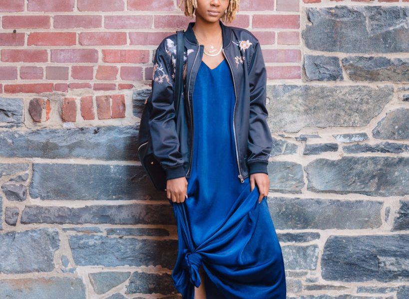 On to my outfit: to take this silk maxi dress from formal to street, I tied a knot at the hem. For the classic juxtaposition element of street style, I threw on my old, dirty Converse. This embroidered black bomber is a great way to add feminine touches, but more importantly, to cover up in a cold classroom without ruining the look. And don’t let anyone tell you that carrying a backpack is not cool, because this leather backpack is just that! My entire outfit, excluding the Converse, are from a independently owned boutique in the Washington, DC area by the name of Violet Boutique. Another tip for you Fashionista/os is to take time and explore new places to shop. You may just find some gems like I did.