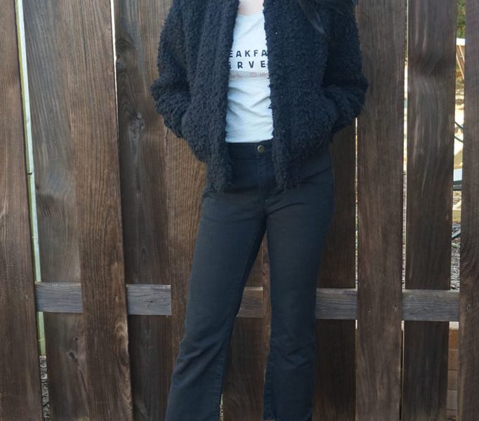 To keep this jacket from looking too relaxed, I paired it with a fun, graphic T-shirt and a pair of cropped jeans. Both of these pieces have also been very popular at the moment, especially the jeans. Cropped flares have become my personal favorite style to wear this season and the frayed hem keeps them on-trend.