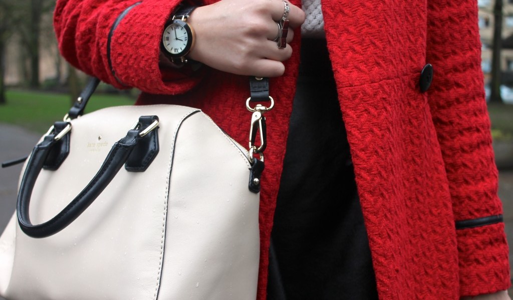 While I normally stick to just black, I knew this was my time to join what colors I did have together. Pairing a white woven pullover with a leather skater skirt, I tried to resemble the classic shape while contrasting the quilted texture with the smooth black of the skirt. The bold red jacket pulled the look together while adding even more texture, combining Céline’s love of outerwear with texture to create what is described as “Work and play in one artful package.” While wearing black and white underneath, it sets off the color of the jacket to make it an even bigger statement. Adding a great bag and hat finishes the look to create my version of the line.