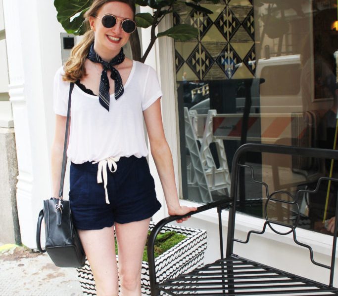 I wear outfits that consist almost entirely of three colors; black, white and blue so it shouldn’t be shocking at all that I decided to partner my neckerchief with a simple white T-shirt, a pair of navy blue short and simple black sandals. Even without my accessory, this outfit was really cute and casual but also very much my own personal style. If Madewell and Aritzia ever decide to do a cross brand collaboration, I would probably be their spokes-girl considering I see so much style from both of those stores in this outfit. I wanted to wear my hair up because of the heat (again, sweat stains are NOT on-trend) and because it looked much more put together compared to my hair hanging down around my face. I wore it in a crisscross ponytail and didn’t have to worry about it for the rest of the night. It was humidity-proof and really easy to do! I topped if off with a pair of simple sunglasses and enjoyed my day in beautiful New York City.
