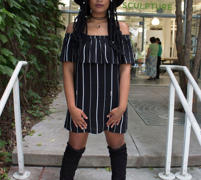 Somehow a stigma about boots in the spring has surfaced. Whenever I bring up the idea of boots in the spring, there is always at least one person jabbering on about hot feet. I have always considered boots to be the perfect go-to. The right boot can both dress up a casual outfit and dress down a going out outfit. Properly pulling off thigh high boot looks in the summer is all about balance. Balance comes from figuring out where you want your focal point to be. In this case, the focal point is the boots. Therefore, like Vauthier, I paired my thigh high boots with a short dress so the eye lands right where the dress ends and the boots start. I chose a striped dress over a solid dress because the stripes add dimension to an otherwise flat look. Although the stripes add dimension, they are subtle enough to not distract away from the boots.